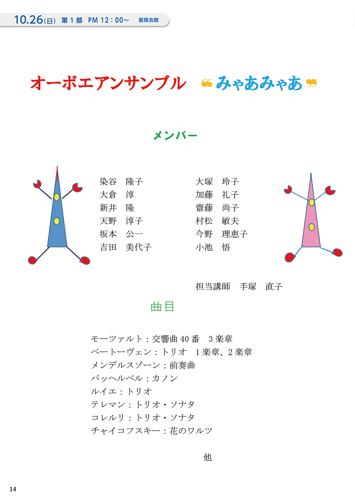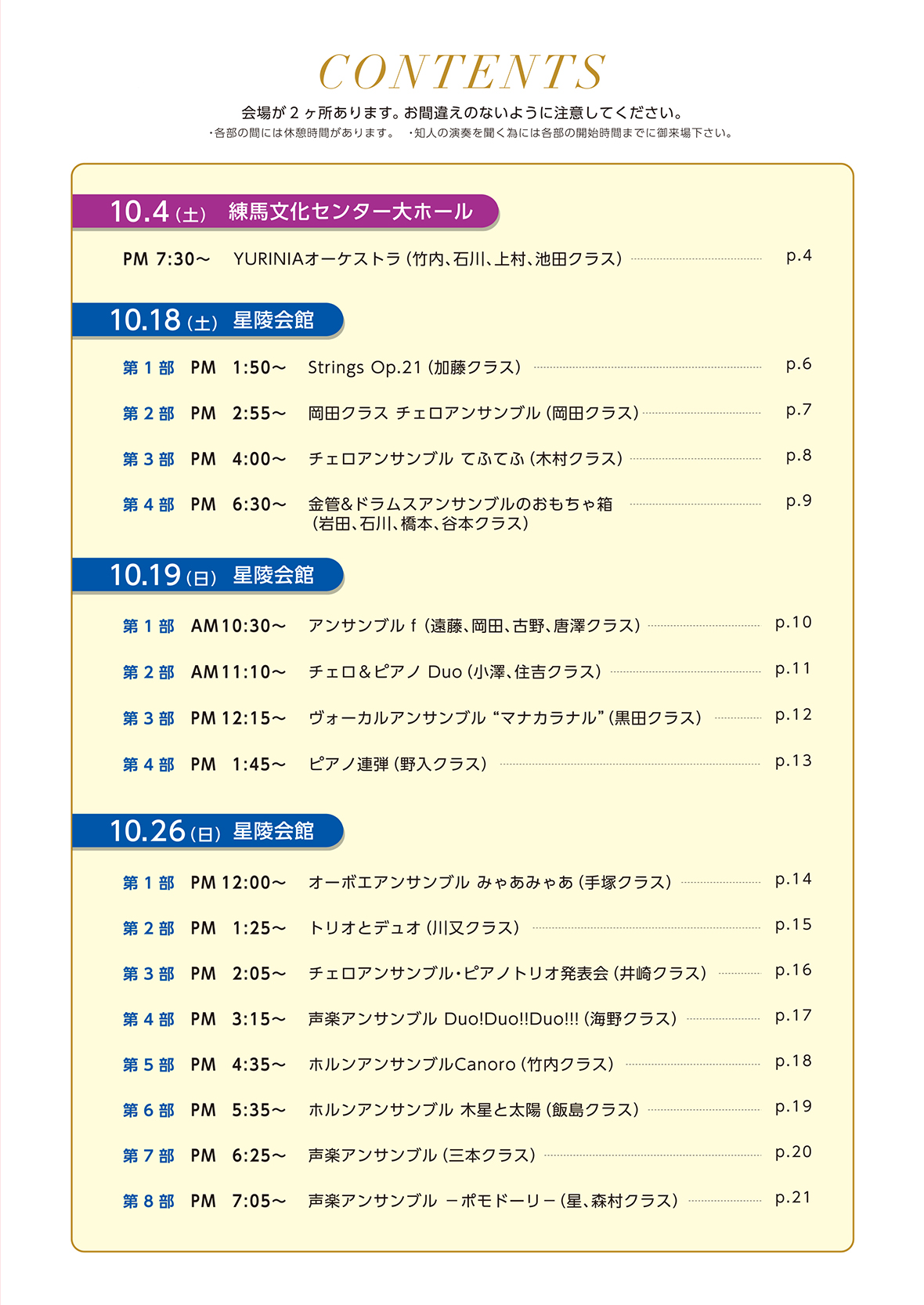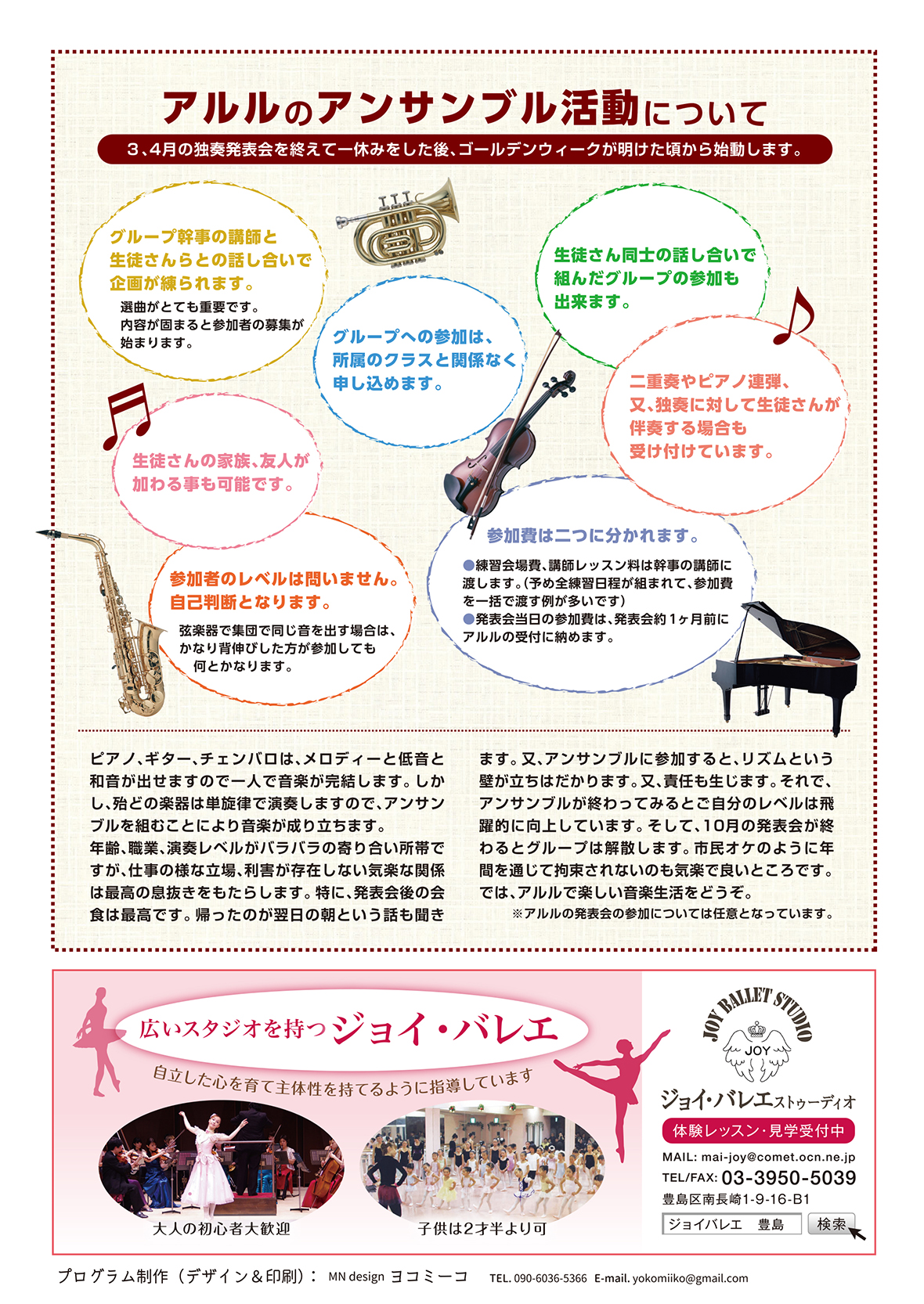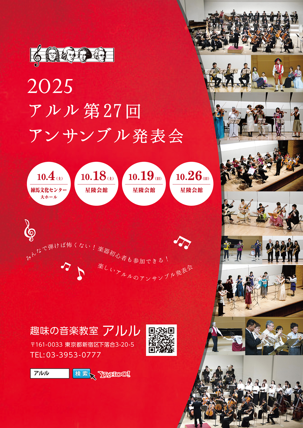 アルル アンサンブル発表会 アルル音楽教室 2025年 10月 4日(土) 練馬文化センター 10月 18日(土) 星陵会館 10月 19日(日) 星陵会館 10月 26日(日) 星陵会館 入場無料 左右2ぺージが一緒になっています。 横にスクロール