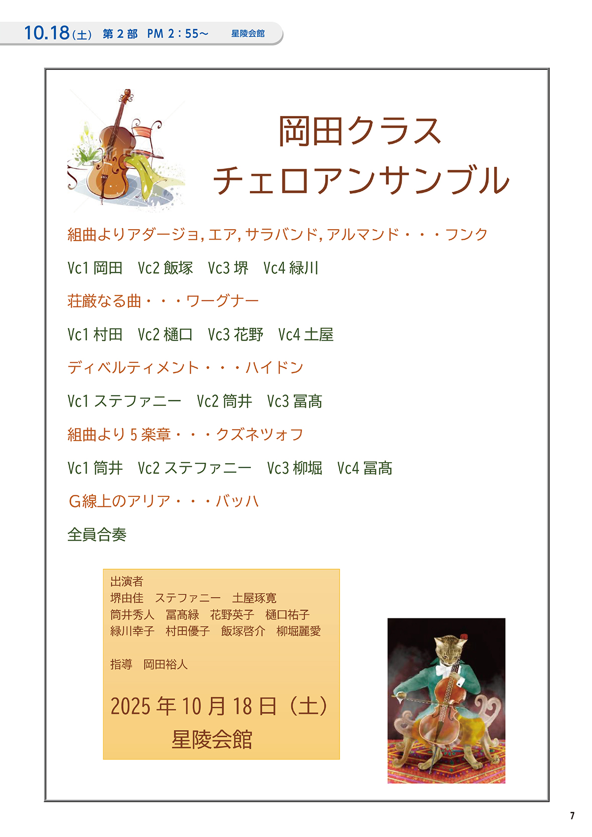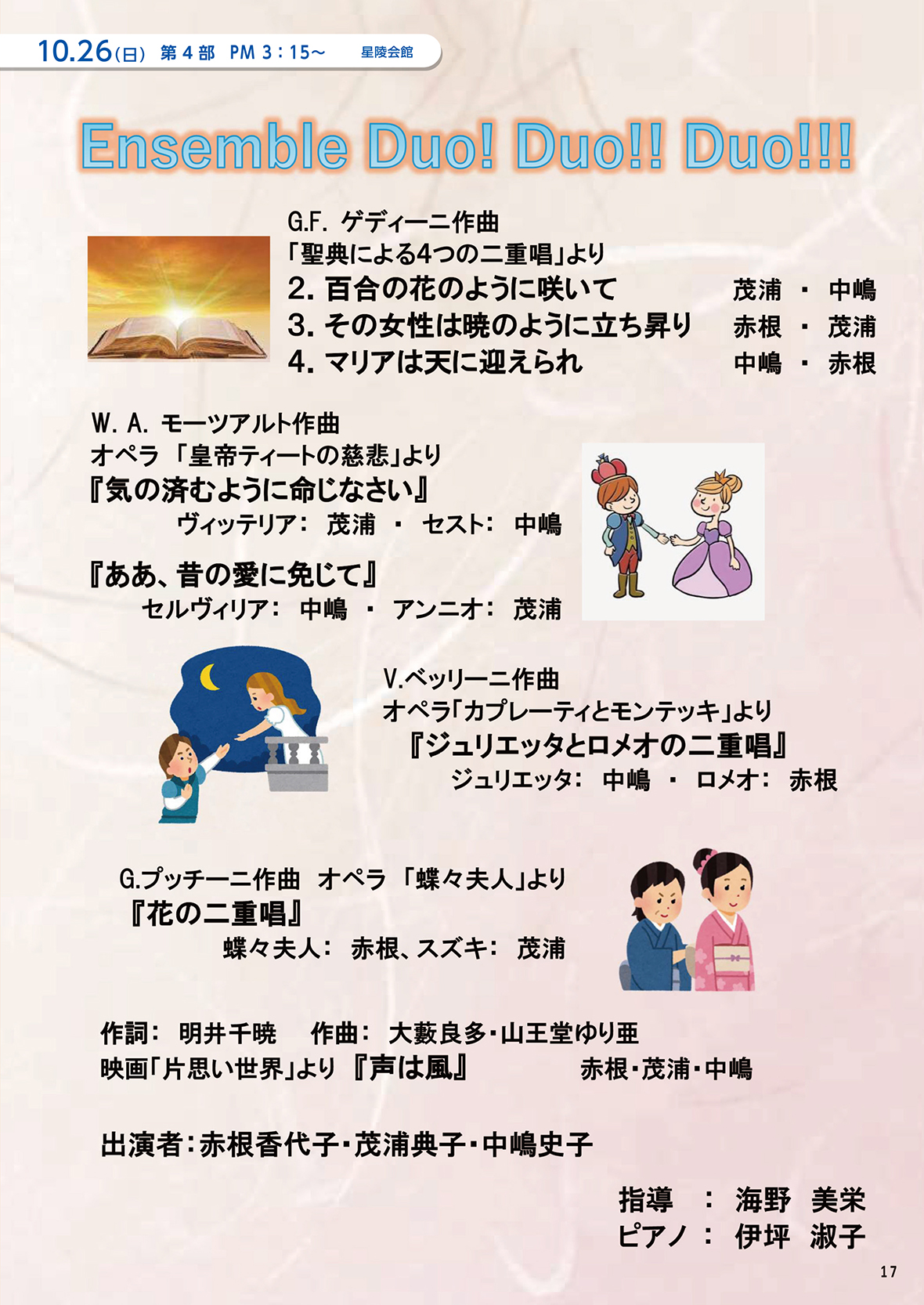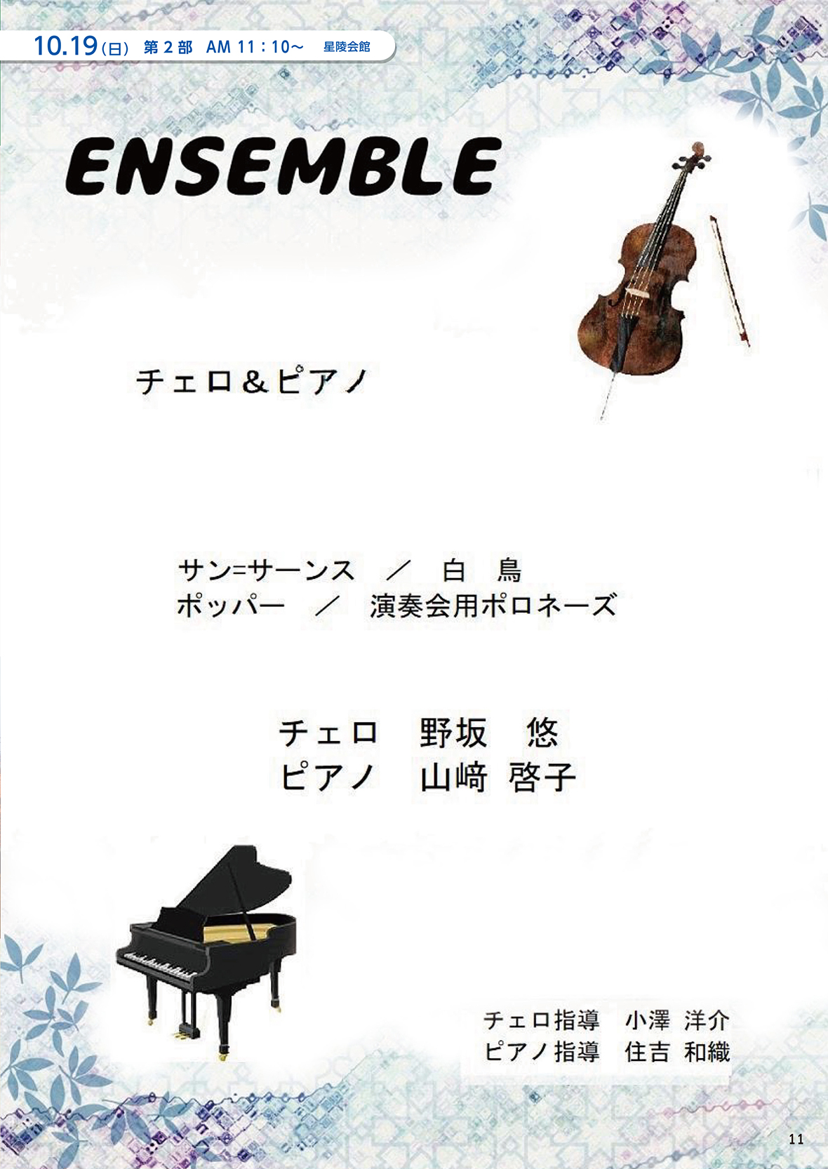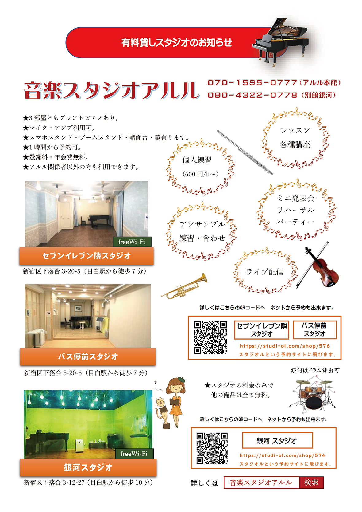 アルル アンサンブル発表会 アルル音楽教室 2025年 10月 4日(土) 練馬文化センター 10月 18日(土) 星陵会館 10月 19日(日) 星陵会館 10月 26日(日) 星陵会館 入場無料 左右2ぺージが一緒になっています。 横にスクロール